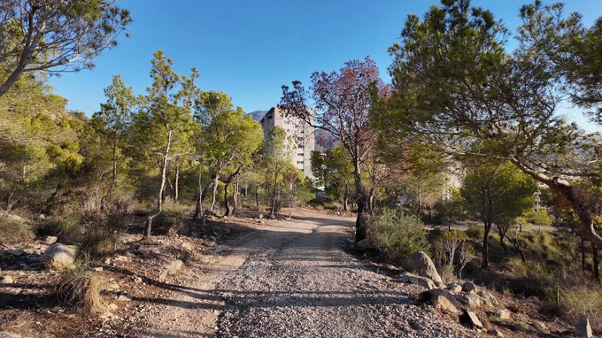A tranquil urban pathway lined with trees and flowering shrubs under a clear sky.